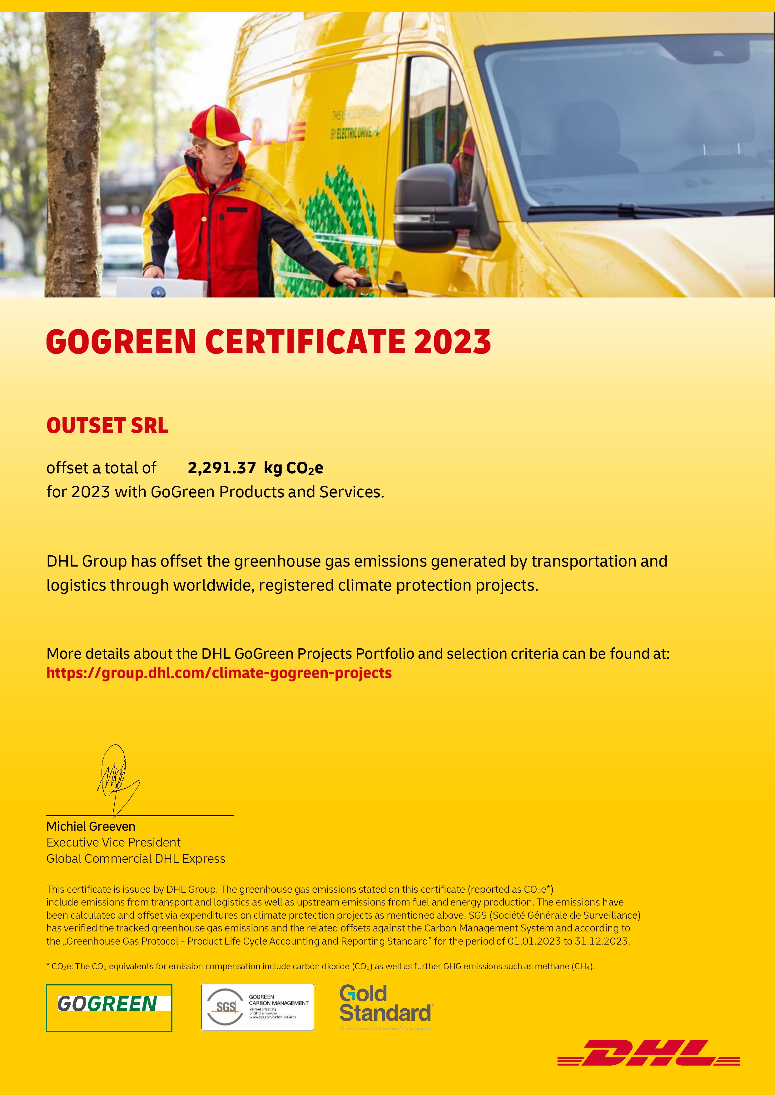 This DHL Group certificate confirms the offsetting of greenhouse gas emissions generated by transportation and logistics through worldwide, registered climate protection projects.